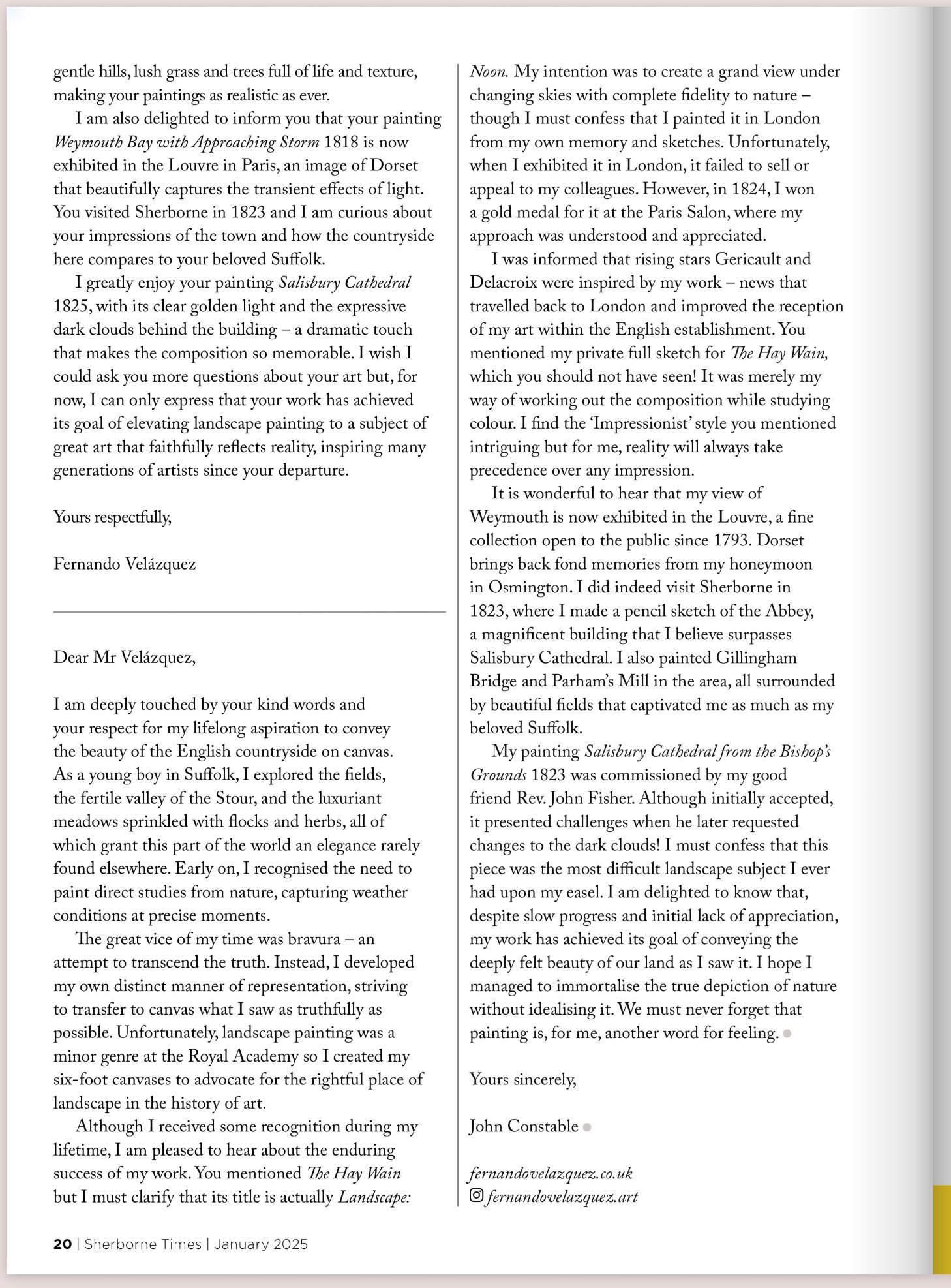 Fernando Velazquez has written his third article for the Sherborne Times. This is part of a new series called “Letters to the Masters” regarding the History of Art. The original and engaging epistolary format contains accurate historical data, offering an insight into the life and work of some of the most important artists in history.