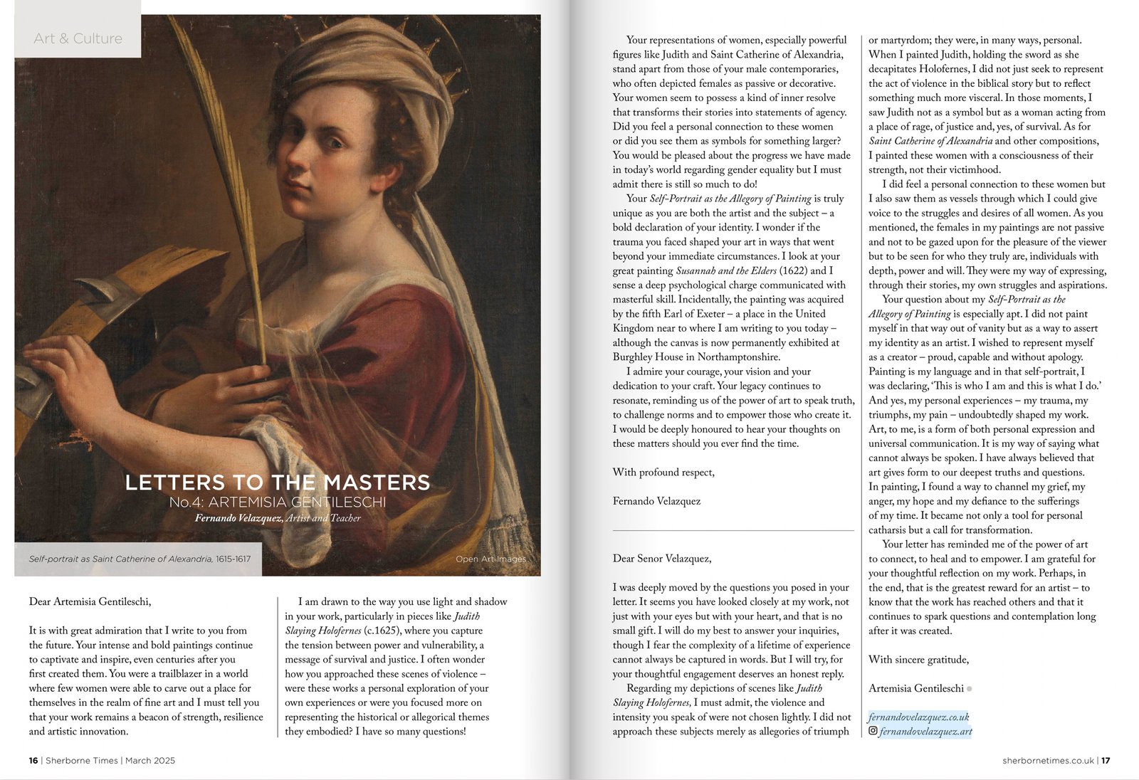 Fernando Velazquez has written his fouth article for the Sherborne Times. This is part of a new series called “Letters to the Masters” regarding the History of Art. The original and engaging epistolary format contains accurate historical data, offering an insight into the life and work of some of the most important artists in history.