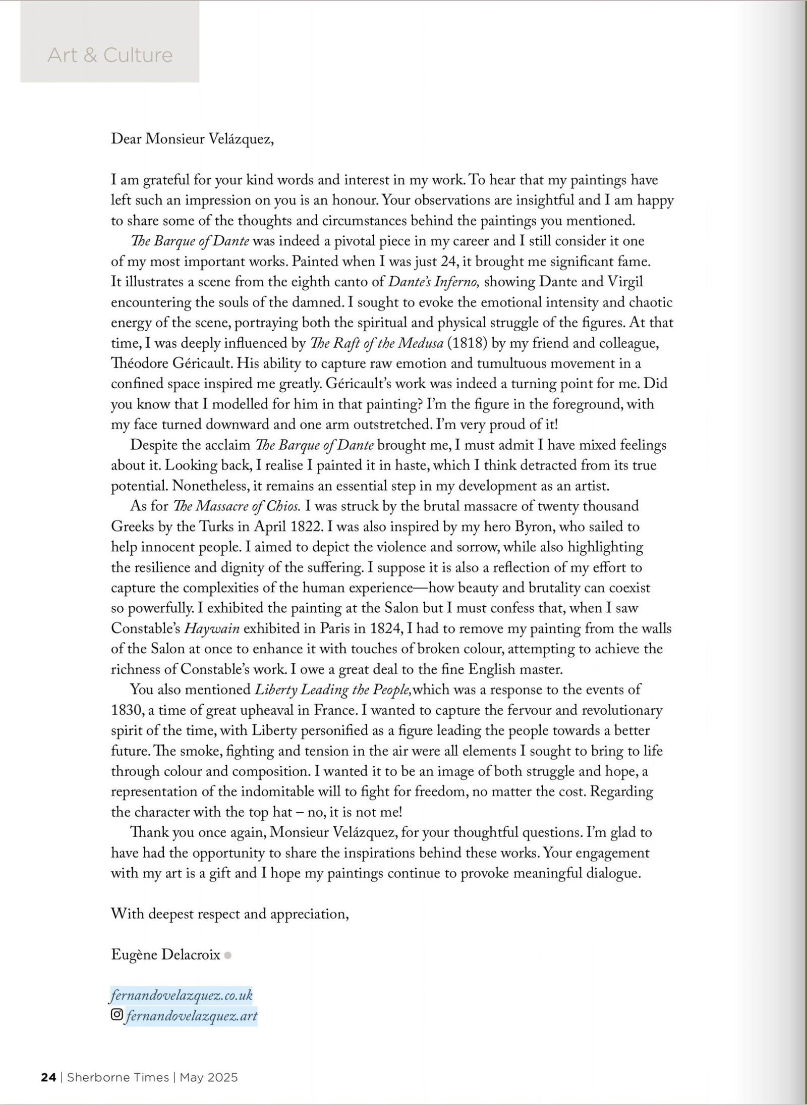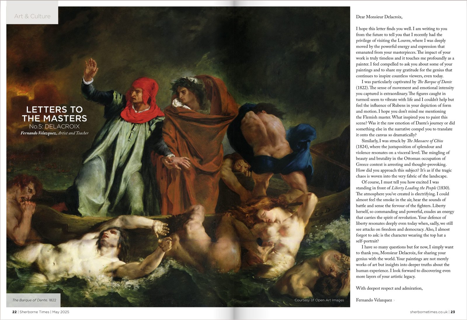 Fernando Velazquez has written his fifth article for the Sherborne Times. This is part of a series called “Letters to the Masters” regarding the History of Art. The original and engaging epistolary format contains accurate historical data, offering an insight into the life and work of some of the most important artists in history.