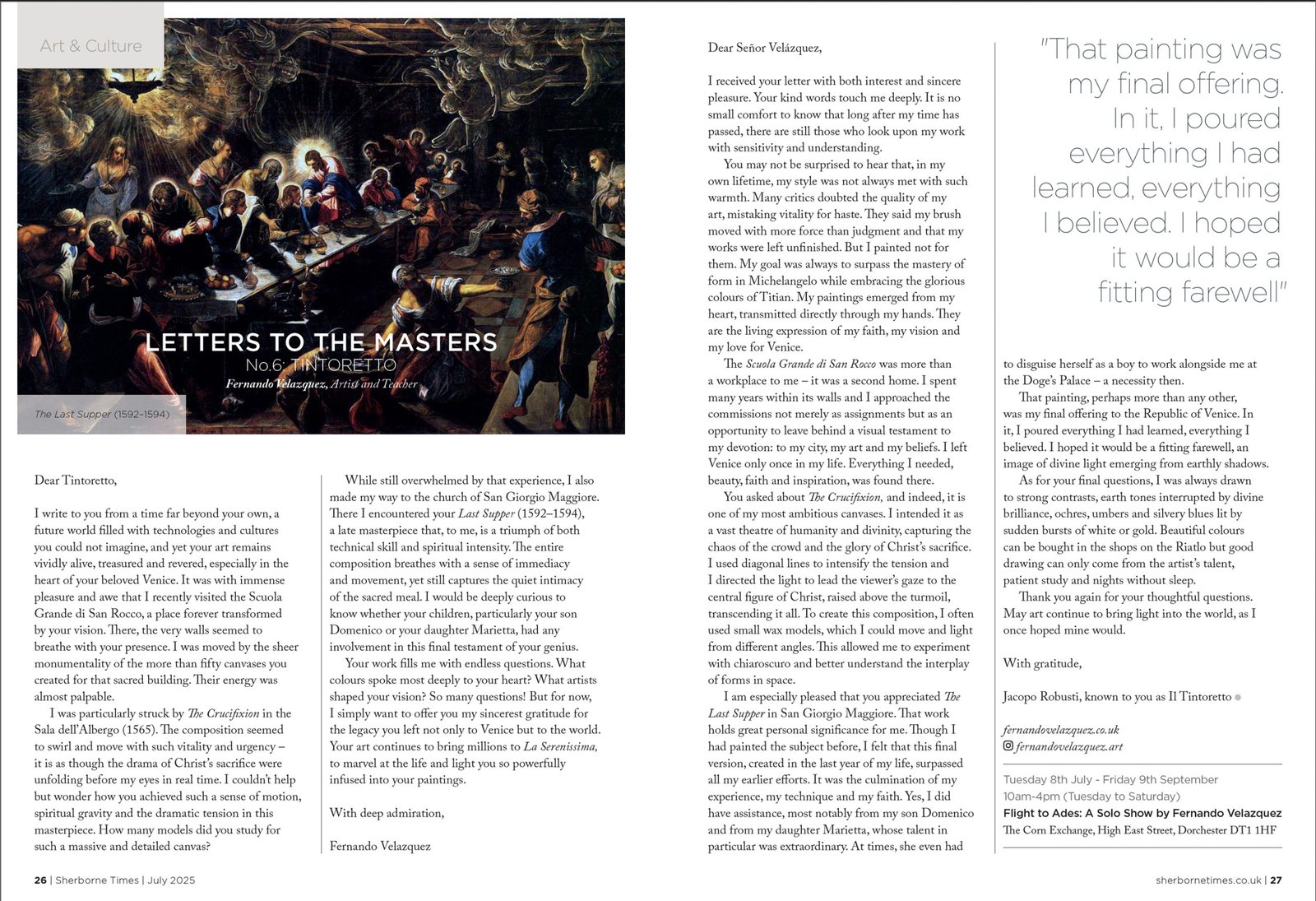 Fernando Velazquez has written his sixth article for the Sherborne Times. This is part of a series called “Letters to the Masters” regarding the History of Art. The original and engaging epistolary format contains accurate historical data, offering an insight into the life and work of some of the most important artists in history.