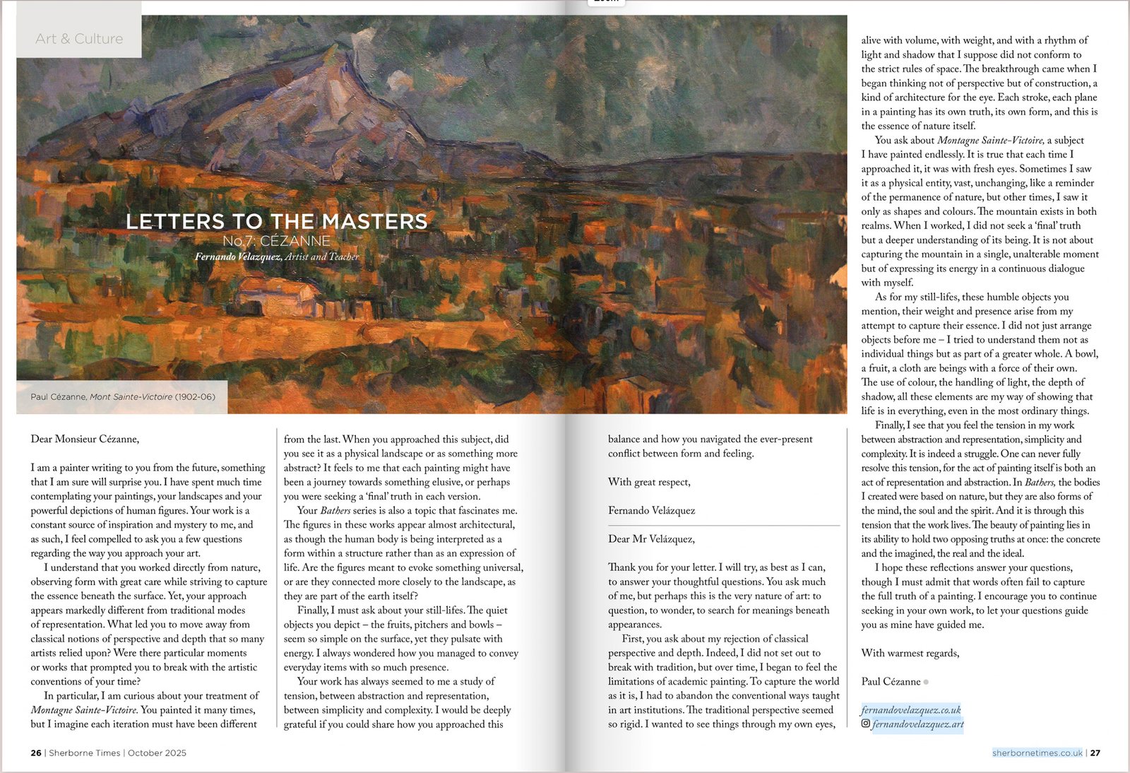 Fernando Velazquez has written his seventh article for the Sherborne Times. This is part of a series called “Letters to the Masters” regarding the History of Art. The original and engaging epistolary format contains accurate historical data, offering an insight into the life and work of some of the most important artists in history.